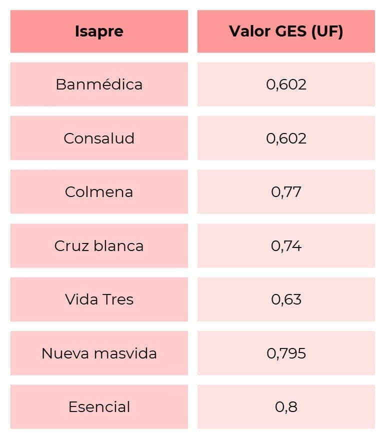 Este valor es diferente en cada isapre y cada beneficiario que se encuentra en el plan tiene un costo por este concepto, como es el caso de los menores de 2 años años, que si bien no tienen un costo de acuerdo a valor base del plan, sí deben pagar GES como cualquier otro beneficiario.